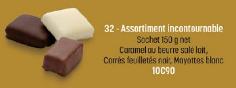 Caramel au beurre salé loit, Corrés feuilletés noir, Mayottes blanc
