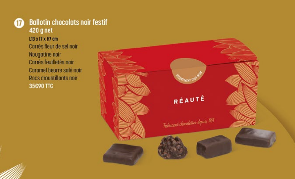- Chocolats présents : Carrés fleur de sel noir, Nougatine noir, Carrés feuilletés noir, Caramel beurre salé noir & Rocs croustillants noir